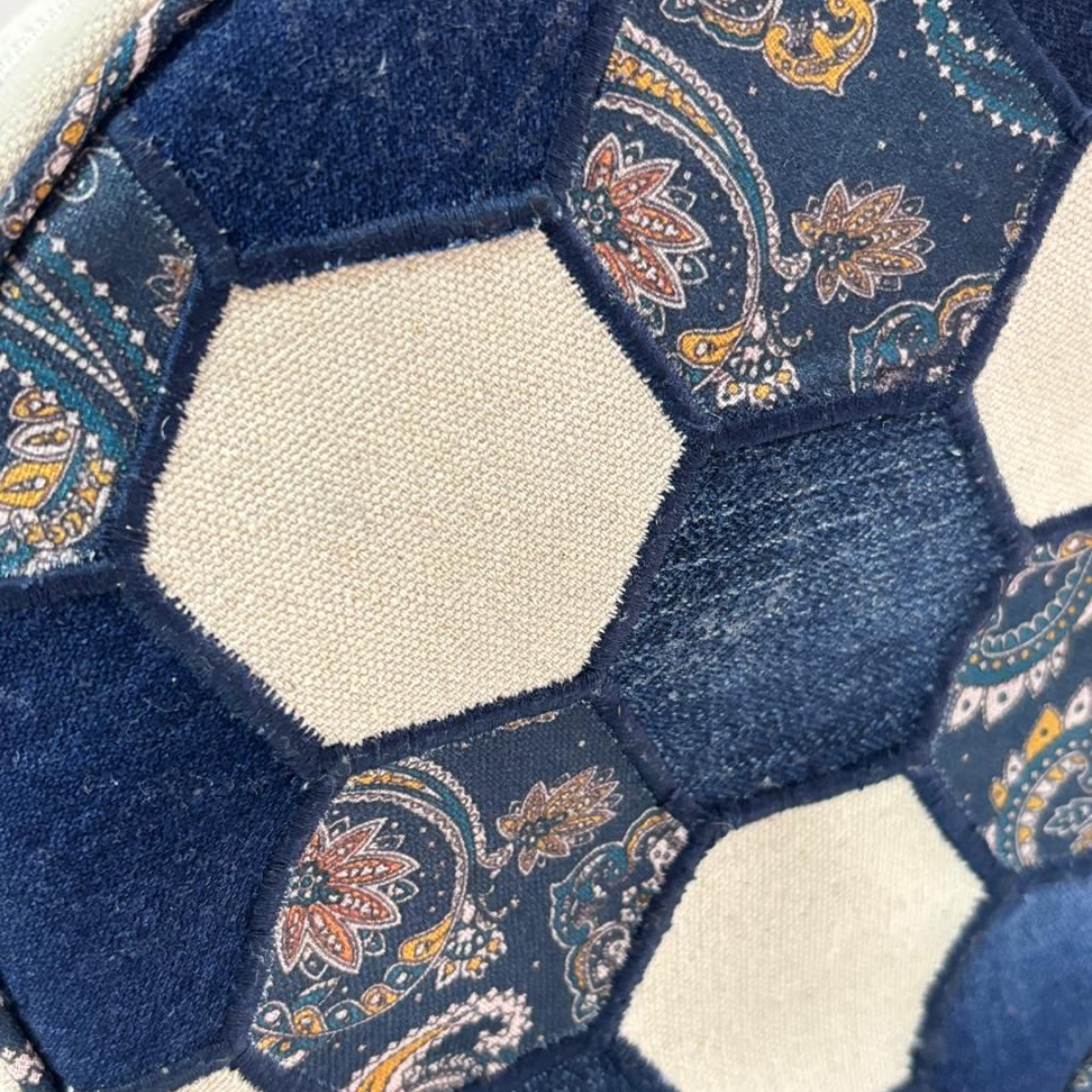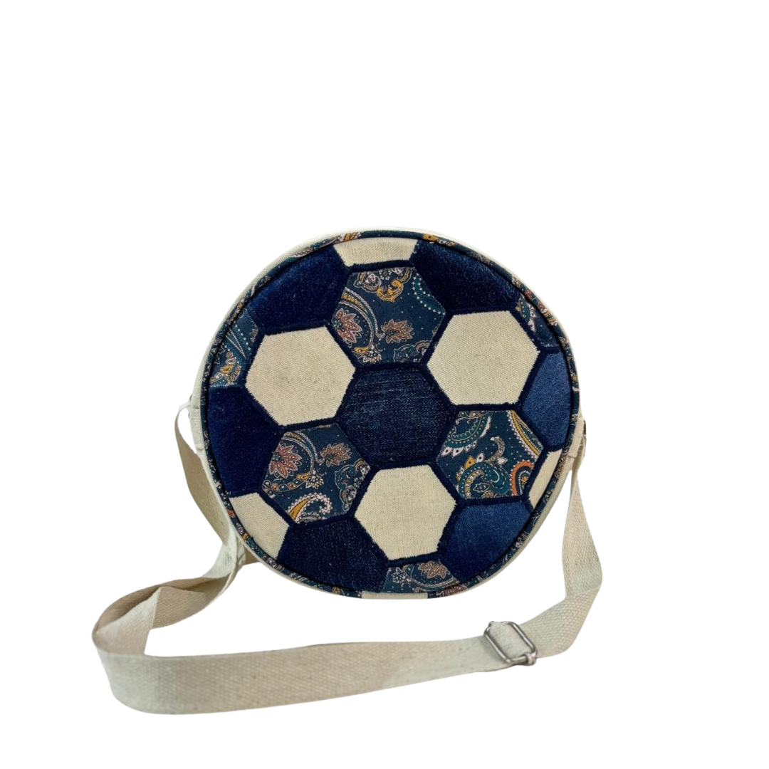 Inspired by the timeless design of a football, this sling bag features a striking hexagon patchwork structure, carefully assembled using sturdy canvas fabric swatches. Each hexagon is individually hand-embroidered, adding texture, depth, and character to the bag. No two bags are exactly the same, making every piece truly one of a kind.